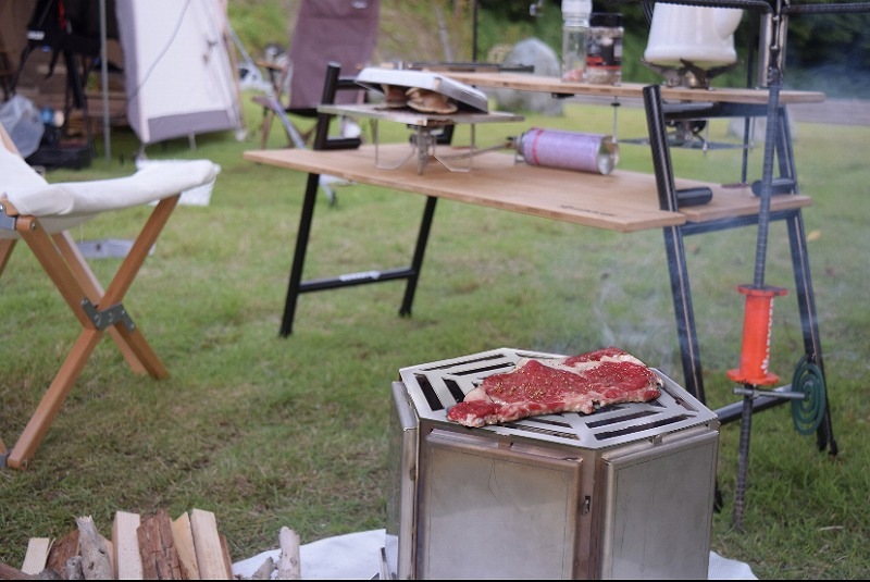 ソロで楽しむのにちょうど良いサイズ。焚火や調理はもちろん、ヒートウォールの上部にスリットが入っているので、串焼きも楽しめます。