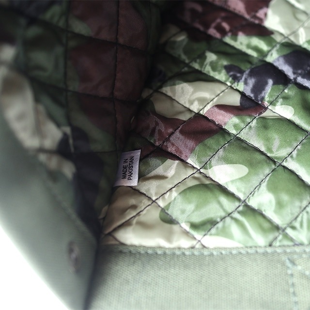 表地はコットン100%のキャンバス生地、裏地はカモフラージュのナイロンキルティング加工なので、